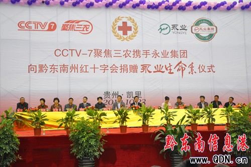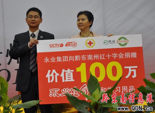 本港訊 (記者 楊驥 攝影報道)2010年10月23日,內蒙古永業集團攜手CCTV農業頻道《聚焦三農》欄目在凱里舉行“永業公益中國行”百萬科技產品捐贈活動,向當地紅十字會捐贈價值百元萬的永業生命素產品,同時向凱里市石橋村小學捐贈價值10萬元的學習用品。州委常委、宣傳部長耿生茂,州政協副主席龍黔清出席了本次捐贈儀式。