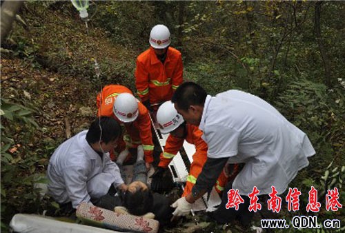事發(fā)地點(diǎn)位于雷山縣城往方祥鄉(xiāng)方向27公里處,途徑雷公山自然保護(hù)區(qū),全程路況較差,山路崎嶇且道路狹窄,用時(shí)1小時(shí)20分鐘才趕到現(xiàn)場。經(jīng)詢問知情人和現(xiàn)場偵察得知,事故共造成兩人被困,其中一名傷員已被醫(yī)務(wù)人員救出,另一名被困者腰椎骨折,傷勢(shì)嚴(yán)重。現(xiàn)場指揮員當(dāng)即命令官兵帶上破拆工具、繩索和擔(dān)架,沿壕溝向下100多米到事故現(xiàn)場進(jìn)行救援,同時(shí)要求官兵注意自身安全,防止被山崖上的落石砸傷。經(jīng)過十分鐘的奮戰(zhàn),我消防官兵順利將被困人員救出,由現(xiàn)場醫(yī)護(hù)人員為其進(jìn)行簡單的救治,然后消防官兵迅速將傷者捆綁在擔(dān)架上,沿壕溝向上抬到公路上,由120送往醫(yī)院救治。