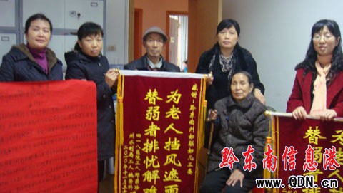 本港訊 (記者 李麗娟 攝影報道)2010年11月30日,一位70多歲雙目失明的老婦人來到黔東南州婦聯,向州婦聯送去了一封感謝信和一面錦旗,感謝州婦聯在老人的合法權益得不到保障時,伸出了援助之手,為該老人請來了法律援助中心的工作人員,挽回了老人的經濟損失,維護了老人的合法權益。