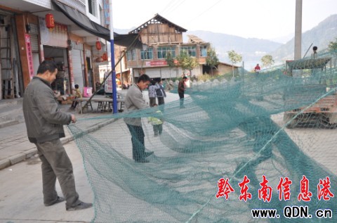 村民胡炳康等三位村民在清理魚網增加網箱養魚量