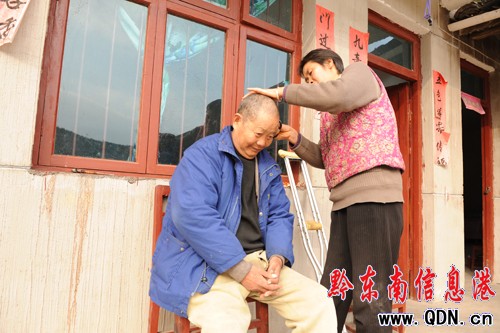 2010年11月在當地村民的指引下筆者來到了位于黃平縣新州鎮西北部的一個小山村——窩田村壇子窯組,見到了這位善良的農村婦女。在一個農家院壩上,一位婦女正在為一位癱坐在椅子上的老人細心的修剪頭發,老人像個孩子似的不時用手比劃著什么,臉上溢滿了笑容。在溫和的陽光下,組成了一副美麗的親情圖。