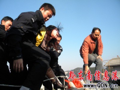 凱里一中隊(duì)官兵以最快時(shí)間趕赴現(xiàn)場后,立即與楊先剛副教導(dǎo)員商議救援方案,同時(shí)鋪設(shè)救生氣墊。楊先剛副教導(dǎo)員利用輕生女子注視鋪設(shè)救生氣墊的間隙,果斷決策,指揮消防官兵和輕生女子前夫,以最快速度沖到輕生女子身后,拉住輕生女子,將其轉(zhuǎn)運(yùn)至安全場所交付給家人,圓滿完成施救任務(wù)。
