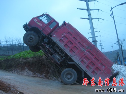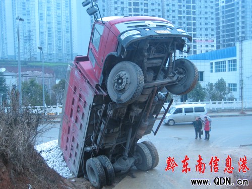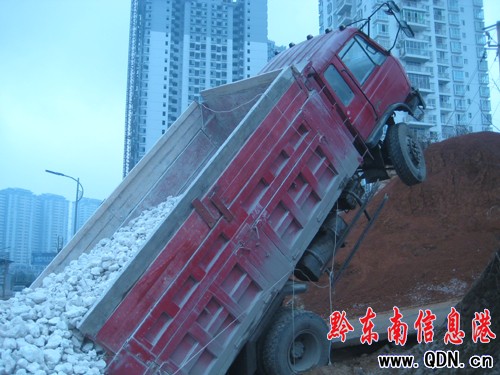 據現場目擊者龍先生說,這輛車從天柱拉石灰石到凱里石灰廠準備加工,到了大友莊新村分路凱里石灰廠路口處有一小陡坡,由于雨天路滑,當大貨車上去的時候,車輪打滑,并向后倒退,加上車上石灰石的重量,使得車輛“頭輕腳重” 車頭像剛起飛的飛機一樣被整個抬起來,車上部分石灰石灑落在路邊。