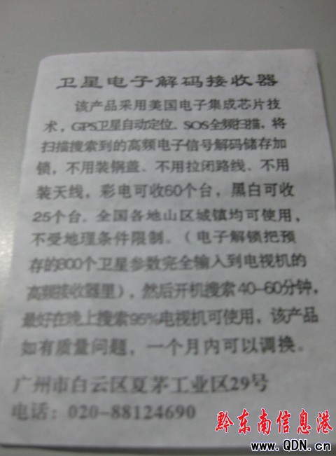 王小姐立即回了神,一個十塊錢的小東西,真的可以不用拉閉路,不裝天鍋就能收到幾十個臺?而且該產品沒有任何的外包裝,沒有任何的產品檢驗合格證,沒有生產日期,這樣的產品有質量保證嗎?過后,王小姐按照那個宣傳單上的電話撥打了廠家的電話,語音提示居然是電話尚未啟用。