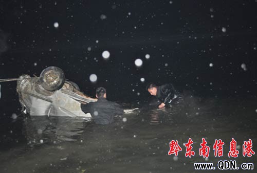 河水冰冷徹骨,岸上寒氣逼人,漫天雪花紛飛,但并沒有難倒?fàn)I救的消防官兵,兩名消防潛水員強忍冰冷的河水,經(jīng)過近半個小時的搜索和偵查,得知車內(nèi)外并無被困人員。這時,派出所人員也查明,事故車輛只有兩名乘座人員。王大隊長下令全體人員利用固定在車兩頭的繩索,將車一步一步的往河岸邊拉,同時,吊車也趕到現(xiàn)場,將事故車輛全部托上岸。整個救援過程組織指揮有序,成功完成了救援任務(wù),充分展現(xiàn)了官兵不畏艱難險阻,英勇頑強,不辱使命的消防風(fēng)采。