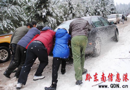 冰雪路面堵車堵心 眾人齊心推車給力(圖)