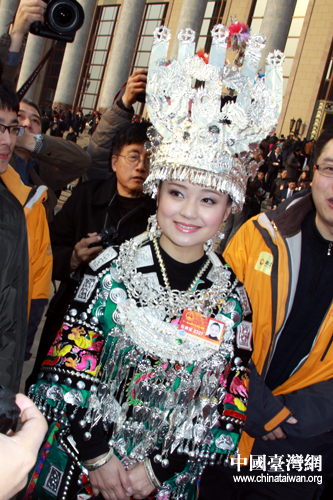來自貴州省黔東南苗族侗族自治洲,被譽為苗家百靈的“80后”全國人大代表阿幼朵。(中國臺灣網 董潔 攝)