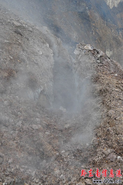 在另一處冒煙的坡面上,記者看到“冒煙口”是一個個的裂縫,最大的裂縫寬約0.5米,最小的寬度也有二、三十厘米。