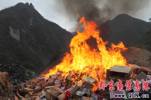 3月13日上午,隨著熊熊大火騰空而起,一批近期查扣沒收的,價值為400余萬元的假煙、假酒、假日用品、過期劣質食品等在凱里市垃圾場被市工商局集中銷毀。(徐國雄 羅茜)