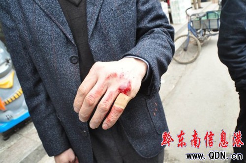 此時,店老板正向警方人員介紹情況,他不時亮出了自己的左手。記者看到,其左手的小指頭上滿是鮮血。目擊者說,這小指頭是在事發時被不明身份的男子舉刀砍傷的。“幸虧沒有砍中要害,要不然,事情就更大了。”目擊者說。