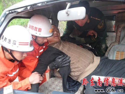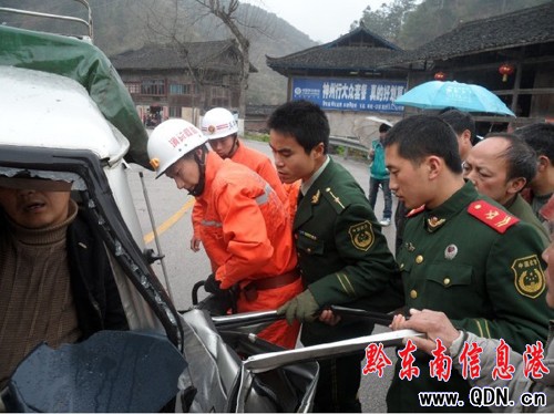 4月7日中午12時許,國道320線臺江至凱里方向十公里處發生一起交通事故,由于下雨緣故,路面比較濕滑,加之事故地段彎度較大,一輛牌照為貴H78396的面包車在轉彎時與一輛迎面而來的貨車相撞,造成車頭嚴重變形,駕駛員雙腿被死死卡在車內,動彈不得。事發后,當地消防立即趕赴救援,20多分鐘成功將被困人員解救。(張小龍 羅茜 攝)