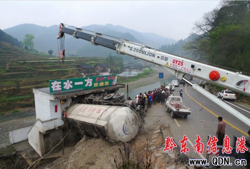 事發后,凱里路政、交警和消防部門立即趕赴現場施救,施救工作一直持續到了4月8日下午4時許。其間,救援小組調集了兩臺高噸位的吊車對肇事罐車實施起吊,但由于肇事車裝載太重,起吊失敗。隨后,救援小組決定實施另外的方案,就是由消防官兵持特勤設備進場,對車輛罐體實施切割。切割工作進展順利,但要將罐內水泥排出,減輕車輛重量,那就有難度了。