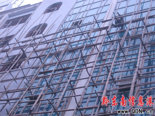 用竹竿搭建的腳手架有十五六米高,沿著房屋墻壁一直延伸到五摟上面, 架上工人正在施工,樓下商店正常營業,人行道上人來人往,如此景象,存在著很大的安全隱患。