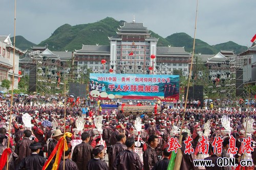 7月6日9時,2011中國·貴州·劍河仰阿莎文化節重頭戲之一的千人苗族水鼓舞展演在新縣城陽光廣場舉行。來自苗族水鼓舞發源地革東鎮大稿午村及全縣12個鄉鎮的苗族群眾1000多人參加了表演。