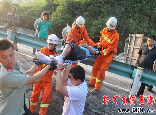 7月25日凌晨5時53分岑鞏消防中隊接到報警稱:玉凱高速岑鞏至三穗段12公里處,一輛裝滿水泥的大貨車發(fā)生側(cè)翻,一名男子被困在駕駛室內(nèi),受傷嚴重,一直不停流血,生命垂危,而且貨車油箱正在漏油,隨時有燃燒可能,情況緊急,請求救援。險情就是命令,接警后,彭天禮大隊長立即帶領(lǐng)中隊8名官兵出動一輛搶險救援車和一輛水罐消防車趕赴事故現(xiàn)場進行救援。