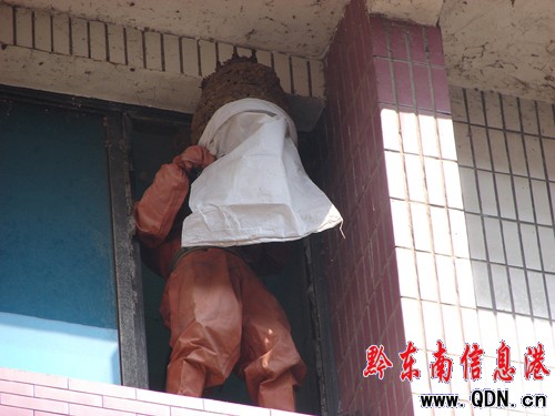 大約5分鐘后,官兵到達該住戶樓下,經觀察發現,該住戶所住的3樓公寓窗外被一巨型蜂窩“霸占”,巨型蜂巢直徑近1米長,且該窗戶外沒有防盜網。官兵經討論后決定,派一名戰士穿上防化服并佩戴安全繩上前摘除,其余官兵保持一定距離并提醒附近住戶將窗戶緊閉,以防馬蜂傷人。準備工作就緒后,官兵們各司其職按照分工迅速行動,經過近15分鐘努力,官兵們順利將巨型蜂窩套入編織袋內,并向蜂巢殘留部分噴灑殺蟲劑。