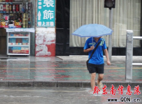 記者在友莊路看到,路面積水成潭,車輛經過時,水花四濺。行人挽起褲管,涉水過馬路。