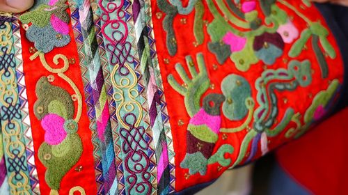 苗族刺繡在顏色上也是非常講究的,紅色自然是喜氣的象征,中華所有民族都是一樣的;綠色表示大自然、山麓、樹木的象征;而服裝整體的深色,則體現(xiàn)出苗族的穩(wěn)重,這與現(xiàn)代人西裝的顏色選擇是完全相同的,可以看出民族間的相同。