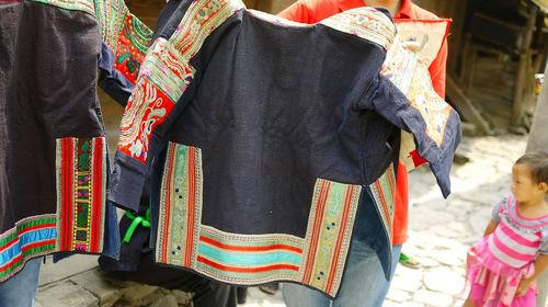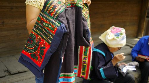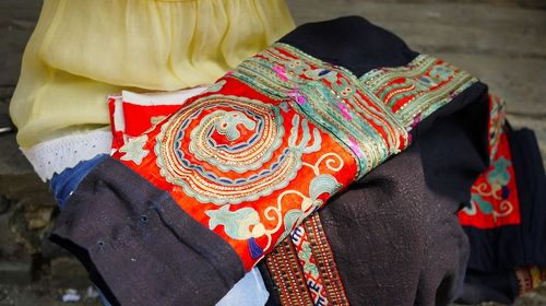 苗族的服飾有便裝與盛裝之分,平日著便裝,節(jié)目或姑娘出嫁時著盛裝。苗族刺繡復雜,做工精細。苗族刺繡的題材選擇雖然豐富,但較為固定,有龍、鳥、魚、銅鼓、花卉、蝴蝶,還有反映苗族歷史的畫面。苗族刺繡十分美麗,技法有12類,即平繡、挑花、堆繡、鎖繡、貼布繡、打籽繡、破線繡、釘線繡、縐繡、辮繡、纏繡、馬尾繡、錫繡、蠶絲繡。這些技法中又分若干的針法,如鎖繡就有雙針鎖和單針鎖,破線繡有破粗線和破細線。