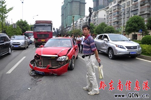 9月9日14時許,在凱里城南客車站往前100米左右發生一起因違章操作引發的汽車連環相撞事故。一輛紅色華普轎車因違章操作,從正在行駛的一輛東風大貨車右邊超車時,華普轎車車尾與東風大貨發生刮搓后,又撞向了左邊正在正常行駛的白色越野車。致三車均不同程度受損,一度造成交通擁堵。所幸在事故中沒有造成人員傷亡。