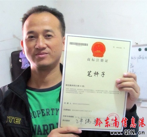 近日,家住凱里經濟開發區的寫作愛好者蒲祖濤拿到了用“筆桿子”三字申請注冊的商標。消息傳出后,引起了關注,目前,已有5家文化機構“開價”要將其買走,其中最高報價達到了50萬元。