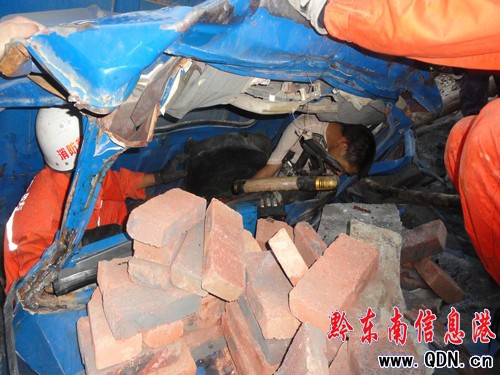17時54分,消防官兵到達事故現場后立即開始偵查。只見一輛滿載水泥及磚塊的中型貨車呈“倒栽蔥”之勢載倒在工地上,車頭已經完全變形被車廂壓在地上,車頭左側散落著車輛的零部件及大量磚塊、水泥,旁邊地上躺著一名青年(已無生命跡象)及一名中年人(已昏迷),消防官兵立即將將兩人送至救護車。在隨后對車輛進行的偵查中,發現駕駛室還有一名青年被困,被困人員被嚴重凹陷的車頭擠壓在駕駛室中生死不明,情況十分危急。指揮員立即下達救援命令,將救援人員分為兩個小組:第一小組負責現場警戒,疏散圍觀人員,嚴禁無關人員靠近;第二組立即實施救援作業。由于車頭嚴重變形,施救空間極其狹小,再加上旁邊散落的磚頭將車頭圍住,加大了救援難度,根本無法利用大型救援工具實施救援,而小型的救援裝備又因車頭被大量磚塊水泥堵住也無法使用。消防官兵決定將車廂“拉”起來擴大救援空間再救出被困人員,由于吊車無法到達事故現場,要想將車廂吊起來只能靠人力,但由于車體過重最終沒有成功,在試過多種救援方案無效后。經過現場醫護人員多次確認被困人已無生命跡象下,指揮員命令一名戰士進到不足50公分的車頭中,由當地群眾幫助擴大救援空間,再慢慢將被困人員遺體移出駕駛室。(趙林林 張金才)