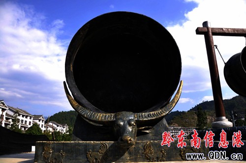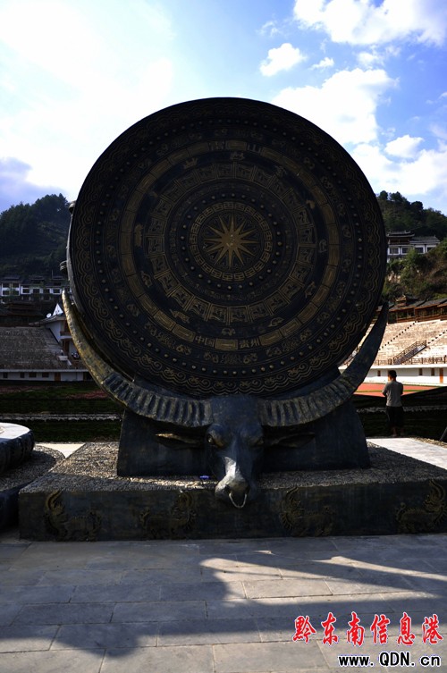 雷山民族文化廣場座落在雷山縣城的北面,呈長方形,東西向。主體圖案為一個大圓圈上均衡地分布著八個圓圈圍繞著中心一個圓圈,象征著雷山縣的九個鄉(xiāng)鎮(zhèn),也象征著蚩尤時代的苗族先民九黎氏族。四角是綠化地。在九個圓圈的東側(cè),是一個大圓圈。由此有人說它象征苗族神話中的十個太陽從遠(yuǎn)古座落到了今天的丹江河畔。在往東,則是呈半圓形的水池,與圓圈有綠化離帶隔離。東西向正中間為主干進(jìn)出通道,從沿河的公路穿過廣場,透過中大街直達(dá)撮箕形青瓦蓋頂長廊的民族體育場。(張鴻)