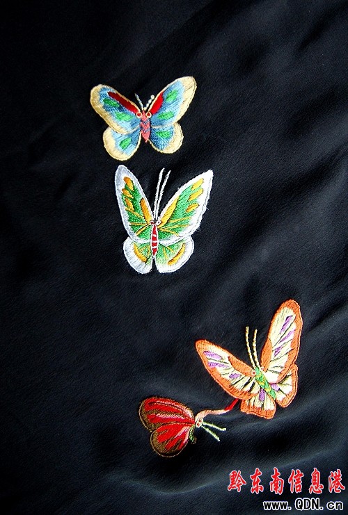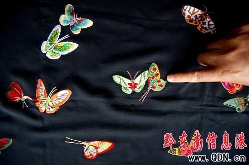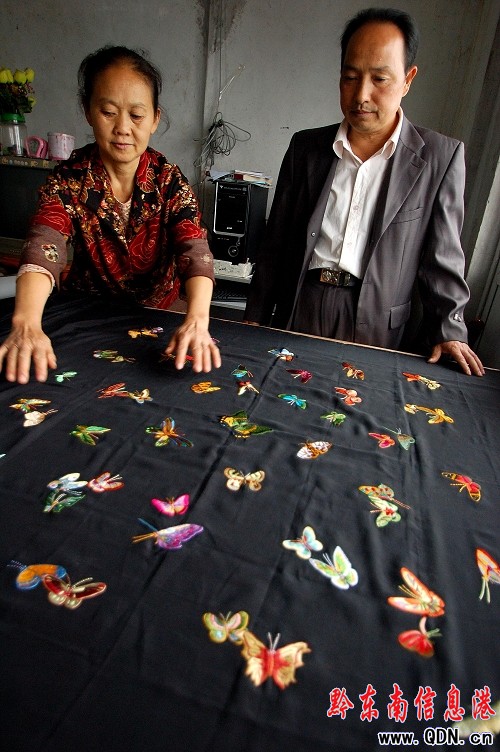 “這樣一塊披肩僅批發價在6千與1萬元之間。”王光德展示著他運用新技法設計并指導繡娘繡出的一幅百蝶圖案披肩說,這塊尚未完工的披肩已有多個客商出高價預計,但由于是他第一個繡出的作品,因此舍不得賣出。王稱,披肩選用的材料都是絲綢,所繡圖案僅限于花鳥昆蟲等吉祥物,一塊披肩繡工耗工時少則20天多則一個月,繡工可獲工錢不低于2000元。王預計在5年的時間里,發展民間繡工1千人,運用新繡法專繡披肩,解決她們的就業問題。