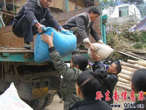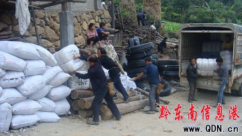各村捐贈的大米運到宰別村