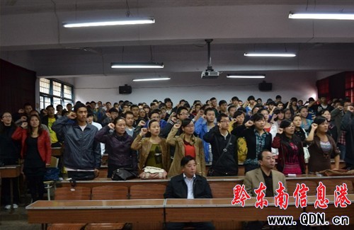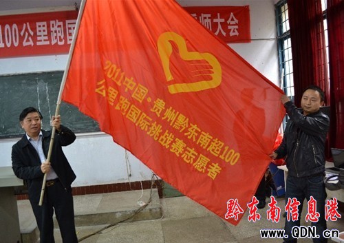 “我自愿加入2011中國•貴州黔東南超100公里跑國際挑戰賽志愿者行列。我承諾,盡己所能,堅守崗位……”11月5日,2011中國•貴州黔東南超100公里跑國際挑戰賽志愿者誓師大會在州財校舉行,400多名志愿者舉起右手,莊嚴宣誓,吹響了超100公里跑國際挑戰賽志愿者行動的號角。州委常委、統戰部部長楊宏遠出席大會并作重要講話。