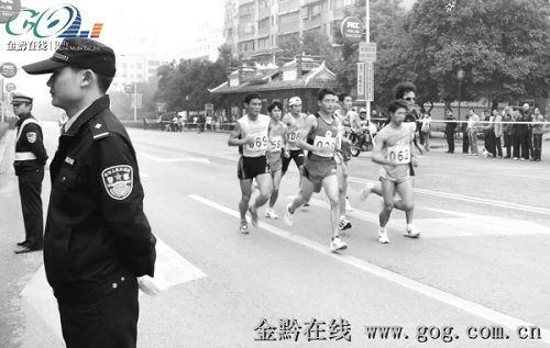 金黔在線訊 近日,黔東南州舉辦的單項國際體育賽事——2011中國貴州黔東南超100公里跑國際挑戰賽在黔東南州凱里、雷山、鎮遠舉行,此次賽事全長105.5公里。黔東南警方堅持早介入、早部署,精心組織警力對起跑儀式現場、頒獎現場及長跑沿途線路進行細致的實地現場勘查,切實做好長跑活動沿途的交通秩序,共組織各種安保力量近2千人次,維護賽事及活動秩序,圓滿完成了安全保衛工作。圖為比賽現場。
