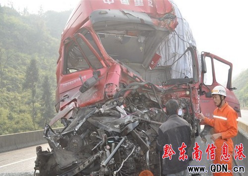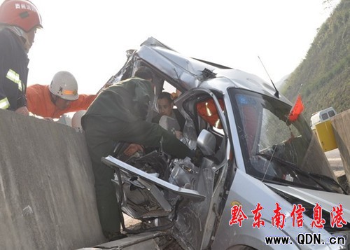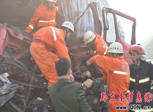 消防官兵到達(dá)現(xiàn)場(chǎng)時(shí),高速路上滯留的車輛已經(jīng)堵成一條大約一公里的長(zhǎng)龍,消防救援車輛被堵在距事故現(xiàn)場(chǎng)400米左右的位置無法通行。見此情況,中隊(duì)指揮員迅速帶領(lǐng)兩名戰(zhàn)士,趕往事故現(xiàn)場(chǎng)進(jìn)行偵察,并下令其它戰(zhàn)士攜帶救援器材跑步前往現(xiàn)場(chǎng)。經(jīng)偵察詢問,現(xiàn)場(chǎng)有6輛車發(fā)生連壞相撞,車上的零件散落了一地,一片狼藉,已有一人遇難被安置在路旁;車牌號(hào)為貴DF1**的紅色小車和車牌號(hào)為湘E3XT**的面包車內(nèi)共5名傷者已經(jīng)在消防官兵趕到之前被救出。但面包車和一車牌號(hào)為魯FG**5掛的大貨車內(nèi)仍有人員被困,大貨車內(nèi)被困者被卡在變形的駕駛室內(nèi),已無生命跡象;面包車內(nèi),一中年婦女已經(jīng)遇難,后排座位一傷者被變形的車體死死的卡住,痛苦地呻吟著,事故面包車一頭栽倒在路邊的隔離帶里,使救援作業(yè)增加了困難。