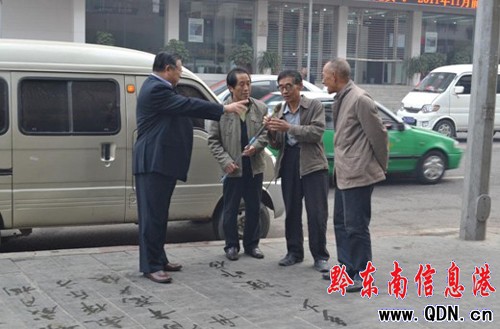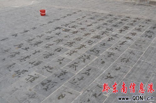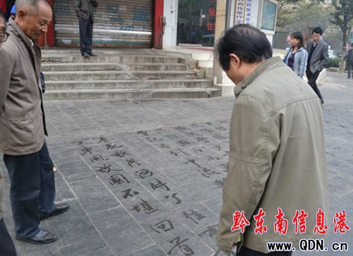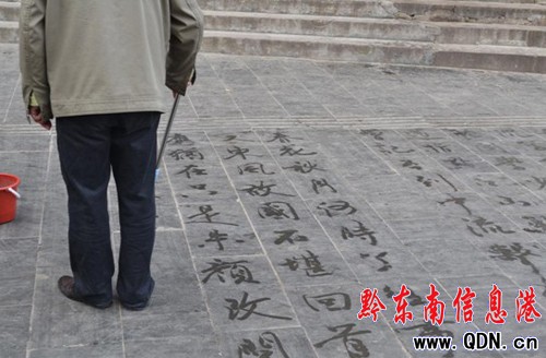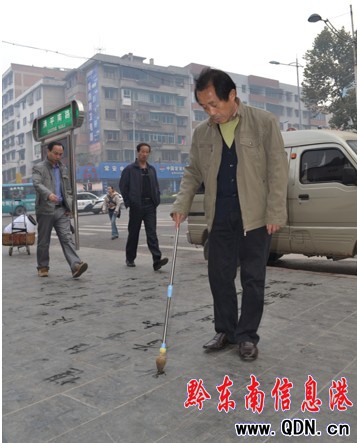 11月24日上午,記者在凱里清平北路口看到一名年約六、七十歲的老大爺,手持一支約1米長的粗大毛筆在馬路邊的人行道青石板上進行書法晨練,常常吸引不少過往路人駐足觀望。走近觀之,其書法筆酣墨飽,筆下龍蛇騰躍筆勢雄健灑脫,如龍飛騰似鳳飛舞,奔放雄壯初寫黃庭。(文筱晟)