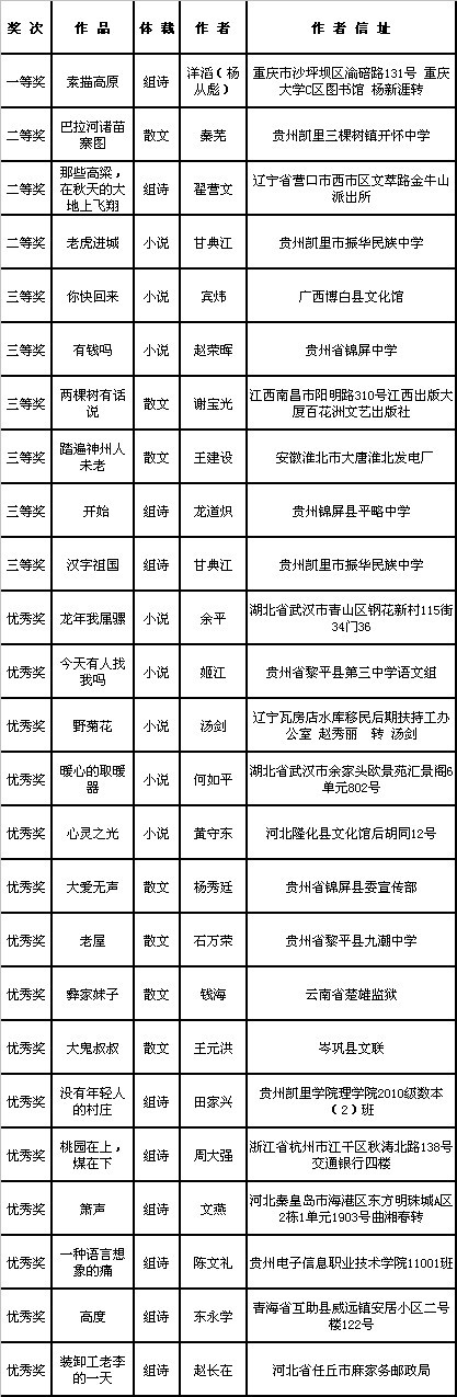 日前,記者從凱里市飛龍雨文學社第四屆“飛龍雨杯”全國征文大賽組委會獲悉,第四屆“飛龍雨杯”全國征文大賽評選已經結束,經專家、評委的反復斟酌、醞釀,認真履行了初評、終評等程序,最終產生了一等獎1名,二等獎3名,三等獎7名,優秀獎15名。組委會將于2012年1月中旬在凱里舉行頒獎儀式,屆時將邀請獲獎作者來凱里領獎,對于凱里以外的獲獎作者,組委會將予以報銷往返車馬費。