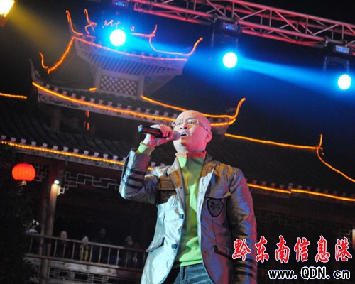 1月10日晚,黎平縣休閑廣場人山人海、氣氛熱烈。湖南省子彈頭演藝傳媒演出的《你在他鄉還好嗎》大型群星演唱會正在進行。電視連續劇《湘西喋血記》肥坨坨扮演者細胖、2010東方衛視“中國達人秀”冠軍超越組合、原創音樂人袁樹雄、2005湖南衛視《超級女聲》黃景、全國網絡歌手大賽冠軍得主唐杰、笑星羅怪才、全國著名歌手光頭李進等明星齊聚侗鄉黎平,為歌迷上演了一場激情四射、空前盛大、極具沖擊力的視聽盛宴。圖為光頭李進傾情演唱的《你在他鄉還好嗎》再一次將演唱會推向了高潮。(周志光)