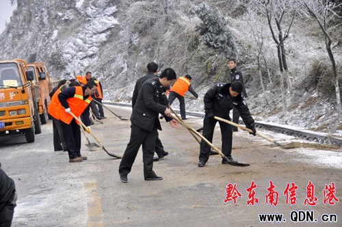 凱里公路管理段路政人員、養(yǎng)護職工在結(jié)冰路段鋪砂鏟雪除冰保暢通