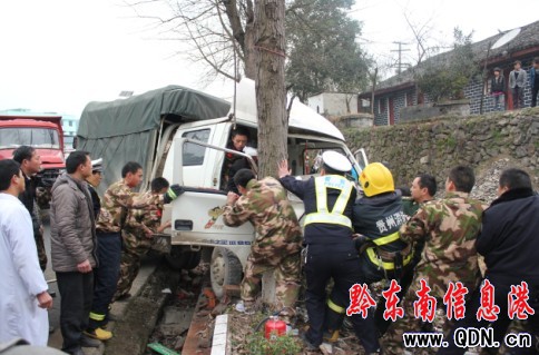 據介紹,當日下午15時35分,三穗縣長吉鄉貴曉村茶坪組駕駛人吳會成駕駛車牌號為貴HK0976的輕型倉柵式貨車,沿上瑞線展架往岑松方向行駛,因天雨路滑,行駛至上瑞線1823公里700米處時,轉彎操作措施不當,致使車輛駛離公路左側碰撞路邊行道樹肇事,造成乘車人梁國發、楊蘭英受傷,梁國發被變形的車殼卡住生命危在旦夕。劍河縣110指揮中心接到報警后,立即通知消防大隊、交警大隊、岑松派出所前往勘查救助,多警種民警接警后迅速趕到現場施救,經過20分鐘奮戰,終于將傷員梁國發從車里救出。目前受傷人員正在醫院治療中。(石慶偉 劉勇)