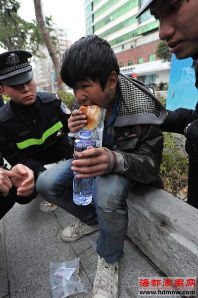 記者趕到現場時,陶光棋仍坐在路邊,被兩位民警攙扶。陶光棋低著頭,一直不愿說話,問他餓不餓,也不回答。民警給他買來面包和礦泉水,陶光棋便狼吞虎咽起來,瞬間將食物一掃而光。附近一酒店的服務員吳小姐見狀,又送來一杯開水給陶光棋,路人蔡先生當即掏出100元給陶光棋。