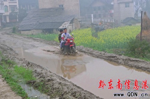 鎮遠縣青溪鎮有一條連接后山、桐木灣、桃坡三個村7000多人的鄉村公路,由于缺乏養護,13公里的路面出現很多大坑大槽。據了解,該段公路是上世紀70年代修建的通村公路,由于缺乏養護資金和無人管理等原因,該路段破損嚴重,一到雨天,路人根本不能行走,給當地群眾出行造成諸多不便。(楊剛)