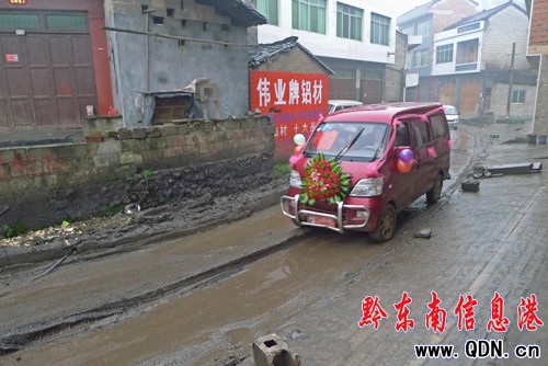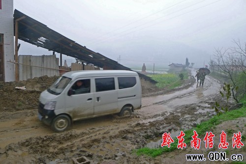 一輛小客車從鎮遠縣青溪鎮后山村爛路上經過