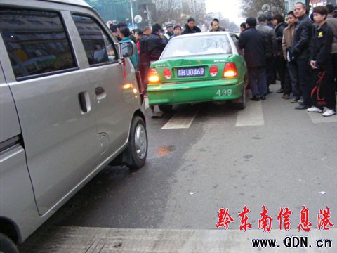 本港訊 (特約記者 金祖發 攝影報道)1月14日18時左右,凱里北京西路中博門口斑馬線上,一輛面包車與的士車發生追尾,在斑馬線上行走的一名男子也跟著遭殃,被撞到后摔出去將近兩米遠,躺在地上動彈不得。