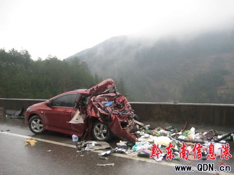 河南籍司機劉某(化名)告訴記者,本田車上有4個大人,兩個小孩,坐在后排的兩個大人及一個小孩當場死亡。另外,受損較重的越野車也造成兩人重傷,其中一人下車時就大口大口的吐血。而兩輛面包車,也有兩人受傷較重。