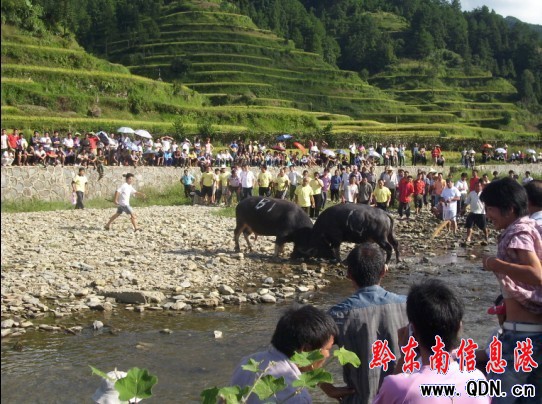 本港訊 9月14日至18日,是貴州雷山縣大塘鄉蓮花片區一年一度的民族傳統節日——“吃新節”,為慶祝節日,促進團結,蓮花片區特舉行了斗牛、籃球、民族歌舞表演等系列民間傳統活動慶祝佳節。圖為斗牛大賽現場。