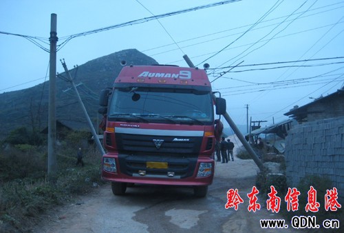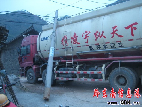 本港訊 (實習記者 龔秀相 攝影報道)12月7號上午11時許,在凱里市舟溪鎮石青路口處,一輛“大個子”散裝水泥罐車,由于車子高大掛到電線并一連把路邊的電線桿拔出來,造成網絡中斷。