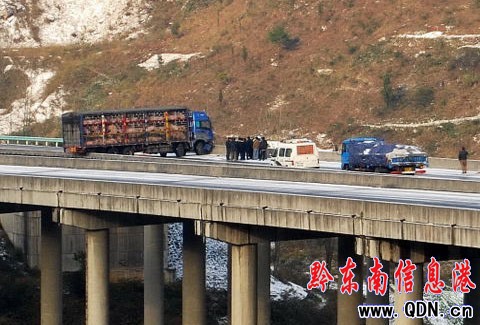 2010年12月16日,一輛運(yùn)輸活豬的卡汽車橫堵在凱里市境內(nèi)滬昆高速結(jié)冰的求雨溝大橋上。