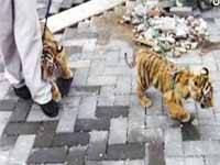 吉林市的徐先生稱,他前兩天逛街時,看見一名男子手牽著兩只黃色黑紋的寵物,還以為是小貓小狗可走近一瞅,原來是老虎,這可嚇壞了徐先生,一些經過的路人也不禁嚇了一跳,都躲得遠遠的。雖說兩只小老虎剛剛出生沒多久,沒什么野性和殺傷力,但是養虎為患,還是應該將老虎從哪弄來就送回哪去。(見下圖)