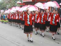 昨日,錦屏縣在城關體委球場舉行“喜迎十八大”健身舞比賽,共有25支來自全縣各鄉鎮的代表隊展參加比賽。老年人舞蹈慶“十八大”,表達她們在改革開放以來錦屏貧困鄉村巨變下農村“老有所樂”,幸福、快樂的精神文化生活。下圖為健身舞代表隊在街上游行。(姜巨標)