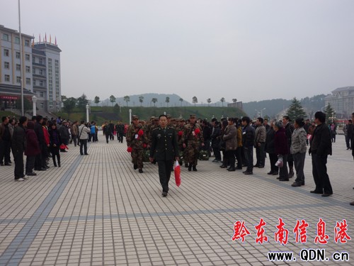 12月12日,“三穗縣2011年新兵入伍歡送大會”在縣行政中心廣場隆重舉行,縣領導龍義立、羅國炳、蔣小平、梁宏顥、吳應文等以及縣直各部門主要負責人出席歡送儀式。該縣經過嚴格審查,精心挑選,層層把關,52名(其中2名為女性)在180多名適齡青年中脫穎而出,光榮入伍,踏上征程。