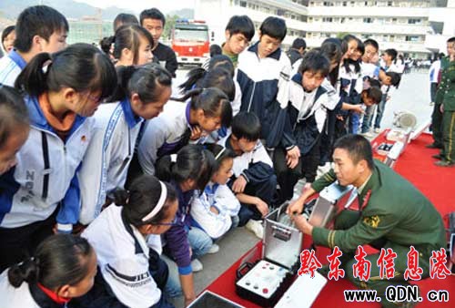 本港訊 (特約記者 張金才 攝影報道)為進(jìn)一步促進(jìn)全縣消防工作的開展,增強全民消防安全意識,11月9日下午,臺江大隊官兵來到縣民族中學(xué),組織該校1000余名師生進(jìn)行“火海逃生”演練,并為全體師生講授了消防安全知識,全面掀起了“119”消防宣傳活動的熱潮。