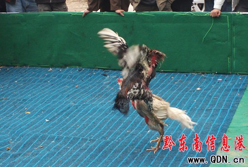 本港訊 (記者 廖強 攝影報道)黔東南州“體彩杯”雄雞爭王賽,今日進入8公斤級的重量級比賽,有來自全國各地以及東南亞地區的40多只名雞捉對廝殺,其中一場越南名雞“花斑虎”對陣凱里名雞“小白龍”的龍虎之爭可謂精彩紛呈,引得在場觀眾連連叫好。